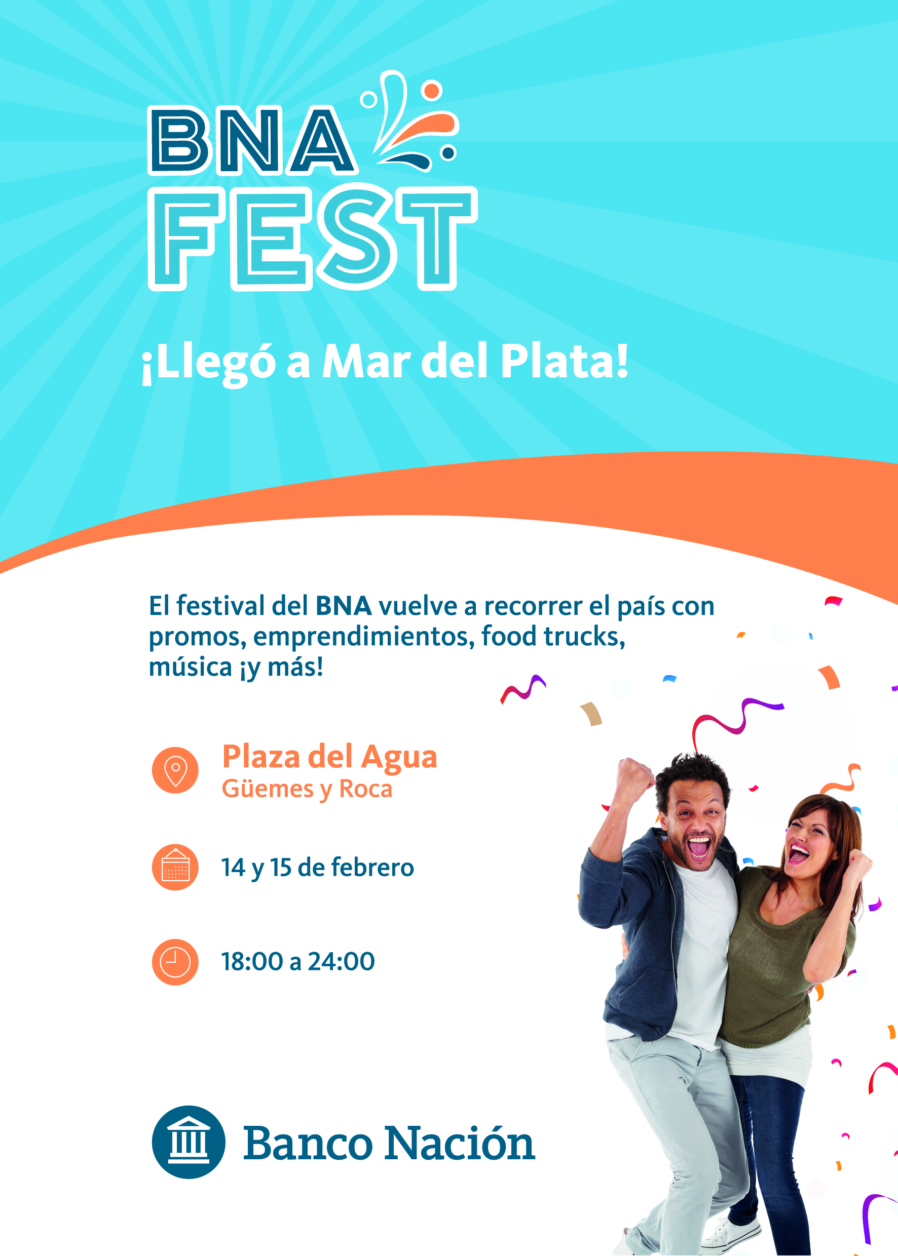 El “BNA Fest”, el festival itinerante del Banco Nación, continúa su recorrido por distintas ciudades del país y, en esta ocasión, vuelve a Mar del Plata este fin de semana con una nueva edición que tendrá lugar en la Plaza del Agua (Güemes y Roca), de 18.00 a 00.00 horas, y que contará con figuras destacadas.