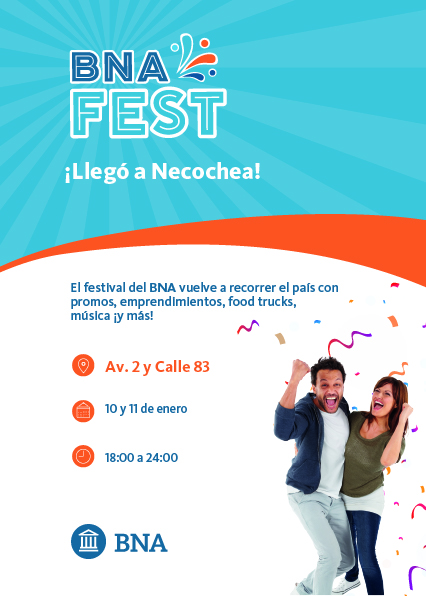 En esta ocasión, el “BNA Fest” se realizará el sábado 10 y domingo 11 de enero, de 18 a 24 horas, en Av. 2 e/ 83 y 85, con entrada libre y gratuita. Durante ambas jornadas, vecinos y turistas podrán disfrutar de actividades recreativas, espectáculos artísticos, propuestas gastronómicas y beneficios especiales a través de las tarjetas del Banco Nación y la aplicación “MODO BNA+”, que incluyen 25% de descuento en gastronomía y productos regionales, a los que se les aplica, además, la posibilidad de pagar en hasta 3 cuotas sin interés.