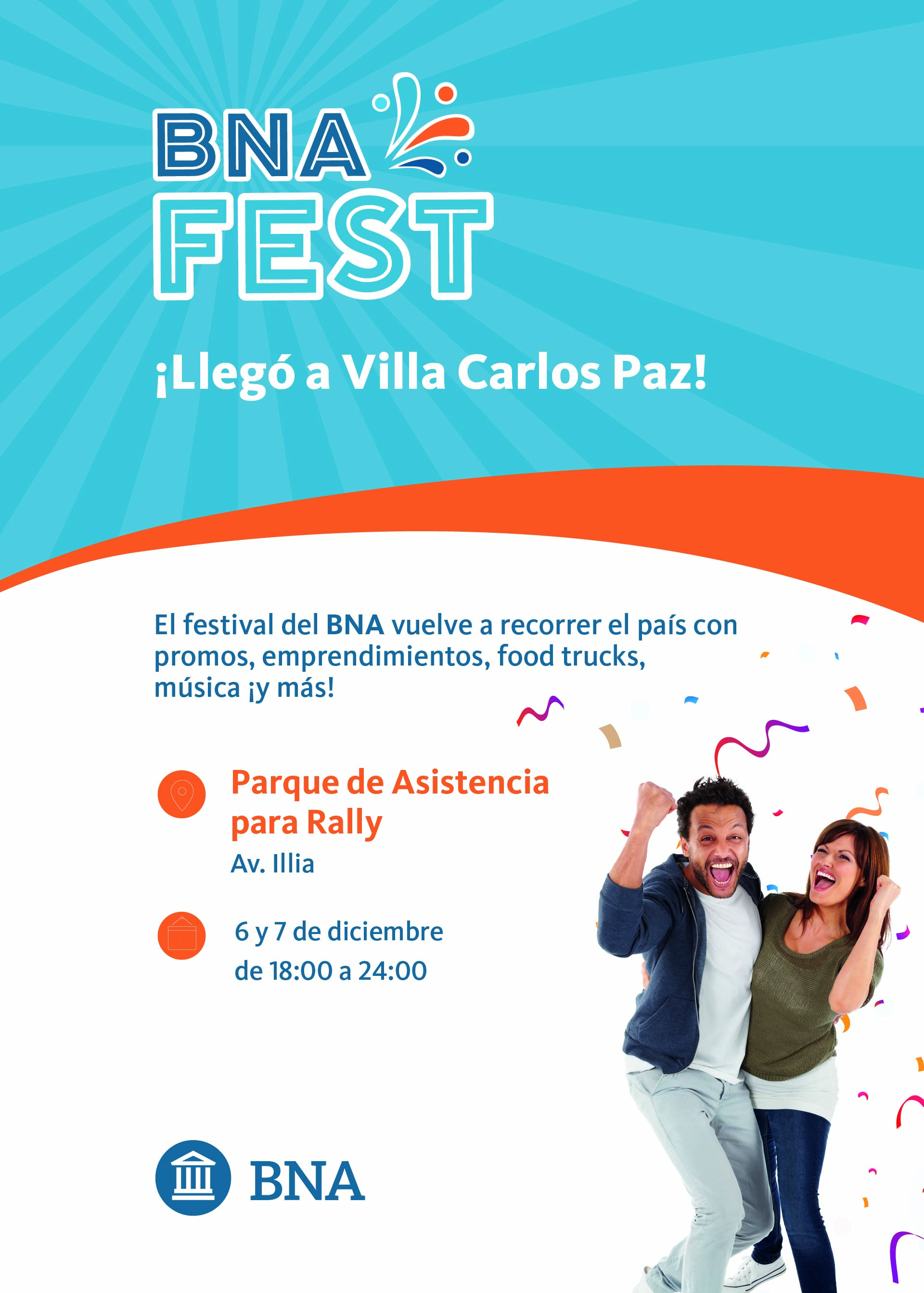 El encuentro será el sábado 6 y domingo 7 de diciembre de 18 a 24 horas, en el “Parque de Asistencia para Rally” (Avenida Arturo Illia X5152) donde se podrán disfrutar actividades y experiencias para todas las edades, y descuentos y beneficios exclusivos que la entidad brinda a través de sus tarjetas y la aplicación “MODO BNA+”, que incluyen un 25% de descuento en gastronomía y productos regionales (o 3 cuotas sin interés para estos últimos).