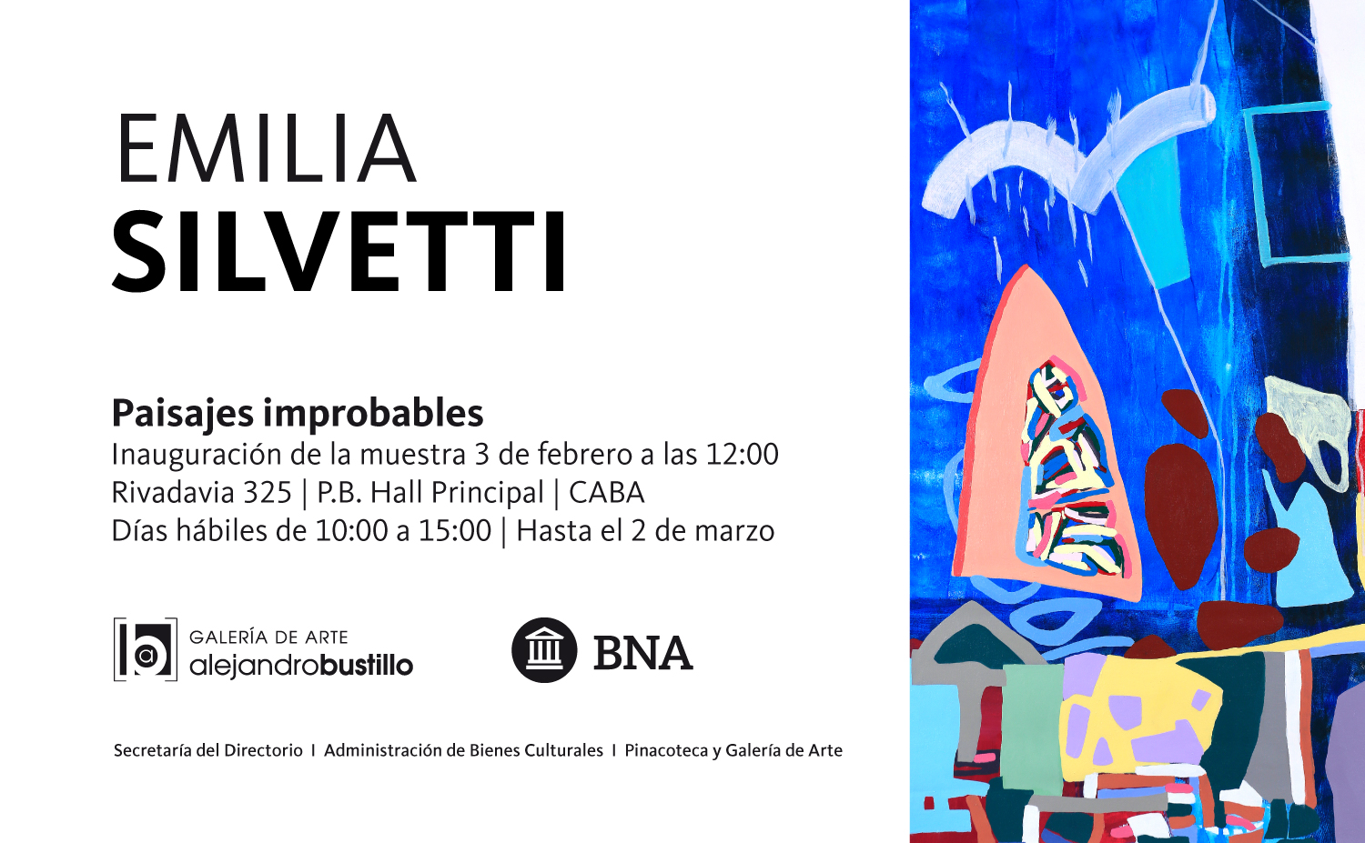 La Galería de Arte “Alejandro Bustillo” inaugurará la muestra “Paisajes improbables”, de la artista Emilia Silvetti, el próximo martes 3 de febrero, en el hall principal de la Casa Central del Banco Nación.