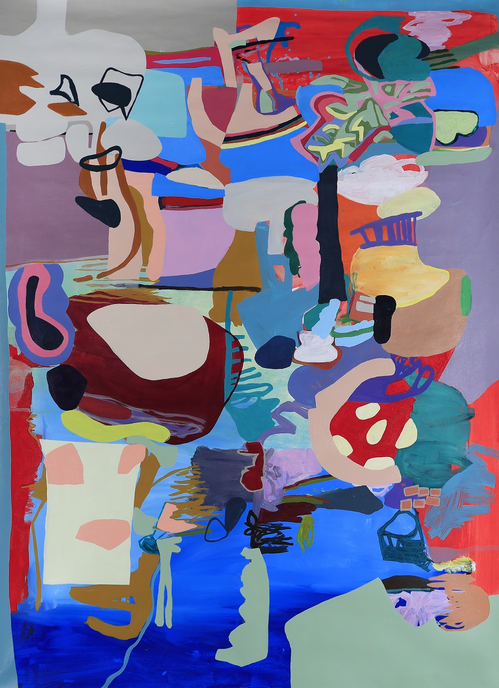 En su práctica, el color ocupa un lugar central: una paleta estridente, de alto contraste y planos definidos articula abstracción, trama y línea como formas de leer el mundo. La artista concibe la pintura como un territorio en capas, en el que se pinta sobre lo pintado, se recorta, se desarma y se vuelve a reunir, generando una ambigüedad constante entre fondo y figura, entre lo que está detrás y lo que aparece adelante.